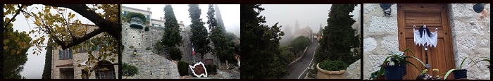 CASTILLON è un villaggio di costruzione recente, dal momento che lo storico nucleo abitativo, posto in quello che oggi si chiama "Colle di Castillon", è stato distrutto dal terremoto dell'800 che ha costretto la popolazione al trasferimento. In realtà oggi nel rinato villaggio la presenza umana è appena percepita, sia in alta che in bassa stagione. La dicitura che vuole il villaggio un "villgio di artisti" ci suona quantomai simpatico, ed è dovuto da disposizioni che si sono date le amministrazioni del passato di cercare di ripopolare il borgo. L'aura tutta particolare che lo cinge lo si percepisce in particolare nelle giornate di nebbia pre-invernale, quando la quasi assenza di suono e l'aspetto austero delle abitazioni in pietra, non antiche come detto, ma costruite seguendo un piano regolatore per consegnarne una coerenza (quel che si dice un "vincolo" costruttivo) ne rilascia un vero fascino suggestivo. La salita al villaggio si può intraprendere da Mentone, attraverso la vallata che trova la sua appendice sul pare dinnanzi al Casinò Barriére, oppure passando prima per il villaggio medievale di Castellar, proseguendo per la "Rou de la Condamine", e innestandosi nella strada della vallata di Castillon, oltre Monti, e prima dei tornanti che costeggiano ciò che resta oggi del "Viaduc du Chiaramel", ovvero la via ferrata dell'antico tramway che collegava Mentone a Sospel (oltre il colle, ai piedi della discesa sull'altro versante). Giunti all'abitato, abbandonata lo stradone, risaliamo la via che si stacca sulla destra che risalirà a spirali in cima al villaggio. Immediatamente si raggiunge la piazzetta della chiesa (foto 1 e a lato) l'area del parcheggio (foto 2) e lasciandosi dietro l'edificio religioso attraverso agili tornanti (foto 3) costeggiamo le abitazioni. In questo caso, dato il periodo (i Santi) addobbato di conseguenza in linea con le tradizioni d'oltreoceano, oggi "europeizzate". [FB] |
