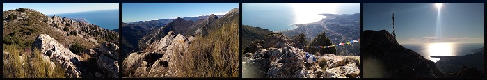 La Cima Longoira (in francese Cime de Restaudm 1147 mt) e la ROC D'ORMEA (1132 mt) sono due cime gemelle, poste a sud del Monte Grammondo e direttamente affacciate sul mare. La seconda, di poco più basso, ne costituisce l’anticima occidentale, e sporge interamente in territorio francese, circa 3,5 km in linea d’aria separano il culmine della Cima Longoira dal litorale di Garavan. Nelle giornate limpide, dalla sommità delle due vette sono ben visibili la Corsica, i massicci dell’Esterel e dei Maures, e buona parte delle Alpi Provenzali. Le due vette sono separate dall’elevata insellatura del Col du Berceau, coperta da una bella pineta. I versanti che si affacciano sul colle sono molto brevi e in gran parte erbosi, risaliti dai sentierini che guidano alle cime. Salendo di qui verso la Rocca d'Ormea, la mularriera si presenta in questo caso più agevole della cima vicina già "scalata" in precedenza, avendo un aspetto decisamente più erboso e meno pietroso dell'altra (foto 1). Questo, contrariamente all'aspetto della montagna. severo con roccia viva (foto 2) che invece si affaccia direttamente su Castellar, essendo questa cima dominante sul villaggio medievale posta com'è direttamente alle sue spalle. Il versante ovest del Roc de l’Orméa scende verso la valle del Caréi con 600 metri di balze e rocce in sfacelo. La vetta del Roc de l’Orméa è segnalata da un paletto metallico con bandierine “tibetane” (foto 3 e a lato). Un'ulteriore appendice della cresca si trova un poco pi+ in basso verso est, ma ne è sconsigliato il transito data l'esiguità di un sentiero in quel tratto, molto "esposto" sul baratro. Dalla cima della Rocca d'Ormea è comunque garantito un fantastico panorama sulla Costa Azzurra (foto 4) e ovviamente sulle montagne poste a nord. Se si potrebbe prospettare una discesa dal Col du Berceau verso la Chapelle St Bernard, risulterà più breve la discesa sul lato Castellar. [FB] |